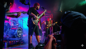 El escenario se enciende con su primer tema y, para no variar, la ya conocida sala Marea volvió a mostrar sus típicos fallos técnicos: micrófonos que no suenan, guitarras más amplificadas de lo normal o incluso un bajo inexistente. Pero nada de esto detiene a los alicantinos, que siguen adelante, impulsados por un público entregado que ha venido a disfrutar de una noche festiva de folk y camaradería.